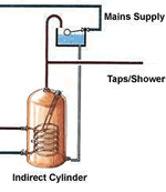 This is the most common form of cylinder available, and may be connected to a central heating system, or as a stand alone unit with an electrical immersion heater. (often called direct cylinders). It is called indirect as there is a large coil inside, which is where the heating water runs through. This is just like an element in a kettle. These are your standard hot water tank/cylinder in you airing cupboard, and normally are 3 ft tall by 18 inches diameter, and some larger ones are 42 inches tall by 18 inches diameter.